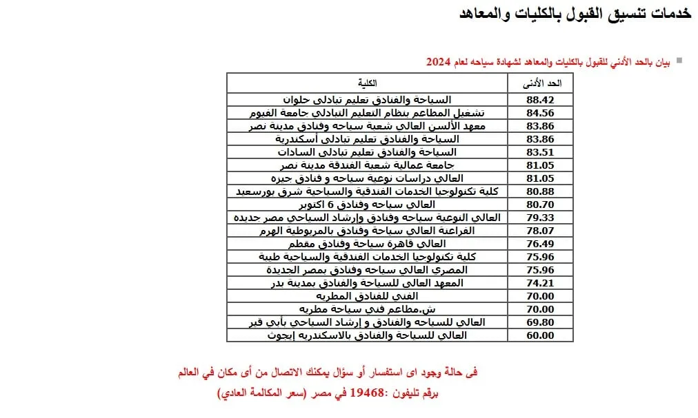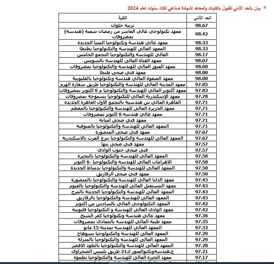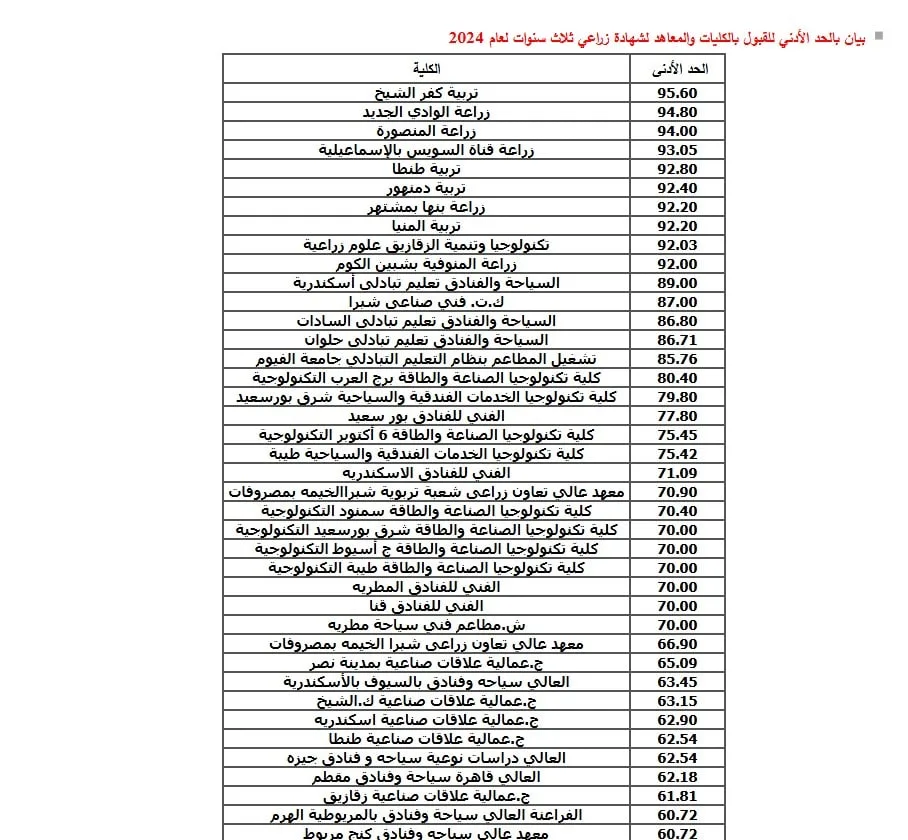 أكدت الوزارة أن الحد الأدنى للتقديم في تنسيق الدبلومات الفنية لهذا العام هو 70% من المجموع الكلي في جميع التخصصات، مع إتاحة القبول في كليات متعددة مثل: التجارة، الزراعة، السياحة والفنادق، الخدمة الاجتماعية، الهندسة، الفنون التطبيقية، الآثار، الفنون الجميلة، التكنولوجيا والتعليم، والفنون التكنولوجية الأخرى.