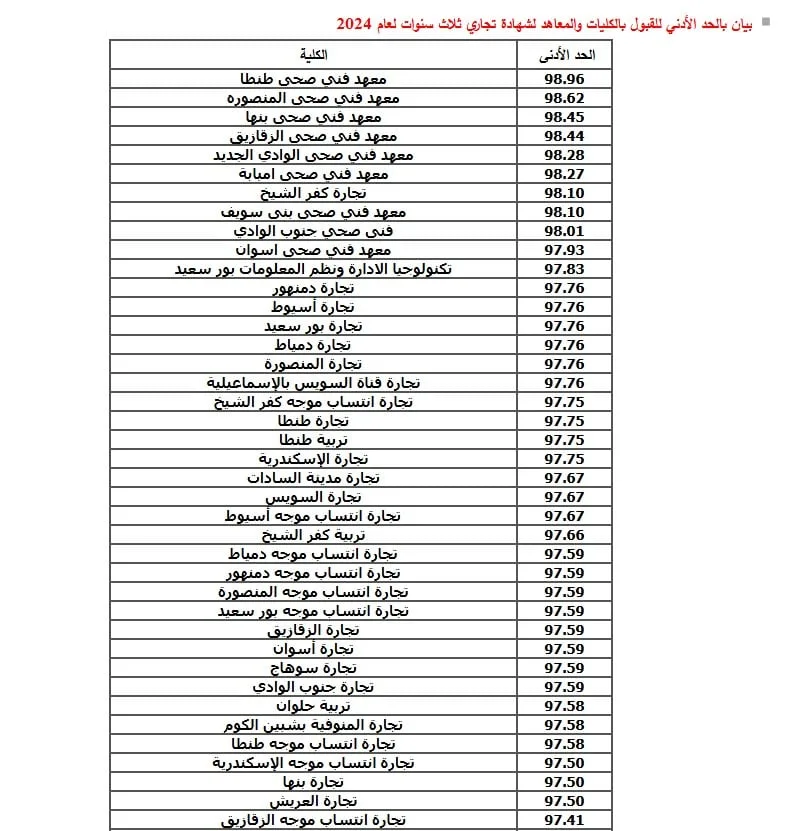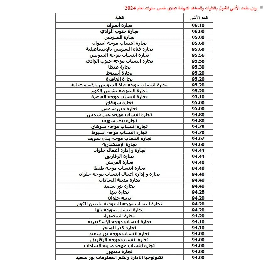 كليات التجارة: تصل نسبة القبول إلى 94% للطلاب من الشعب الصناعية والتجارية.