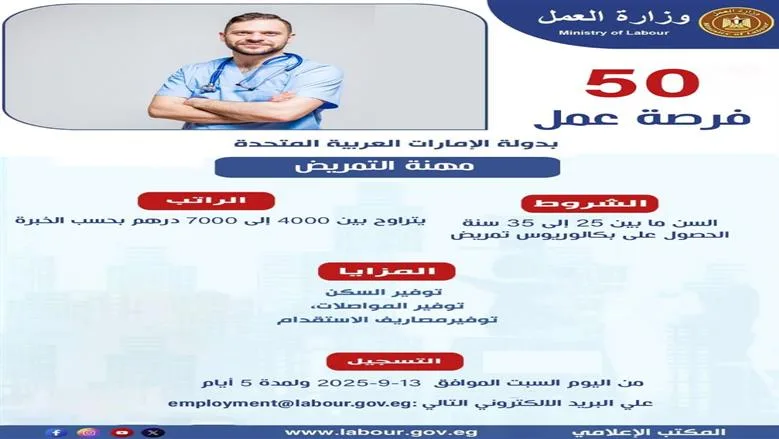 وفي إطار هذه الجهود، أعلنت وزارة العمل عن 50 فرصة عمل جديدة في مجال التمريض للعمل في كبرى المستشفيات والعيادات الطبية بدولة الإمارات، مع توفير رواتب مجزية تصل إلى 7000 درهم شهريًا، بالإضافة إلى مزايا عديدة مثل الإقامة والسفر.